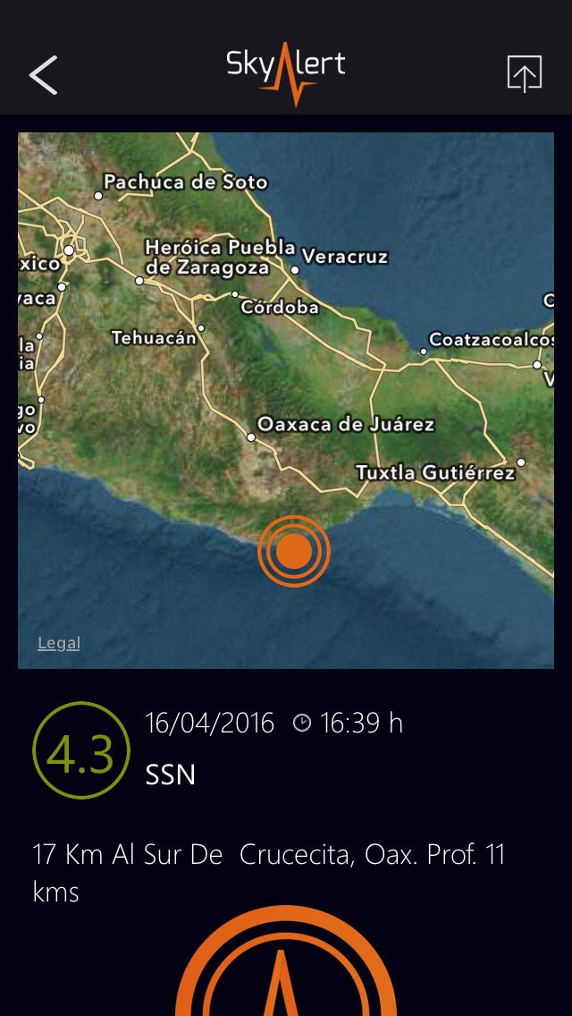 SkyAlert twitteó: Sismo frente la costa sur de Oaxaca - SSN. Percepción leve en la zona del epicentro.